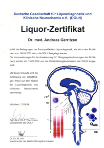 Des Weiteren ist das Medizinische Labor Bremen anerkannt als Liquorfachlabor der Deutschen Gesellschaft für Liquordiagnostik und Klinische Neurochemie e.V. (DGLN). Das Zertifikat drückt das langjährige spezialisierte Leistungsangebot für Neurologen und Psychiater mit dem Anspruch an eine hohe Qualität der Analysen aus.