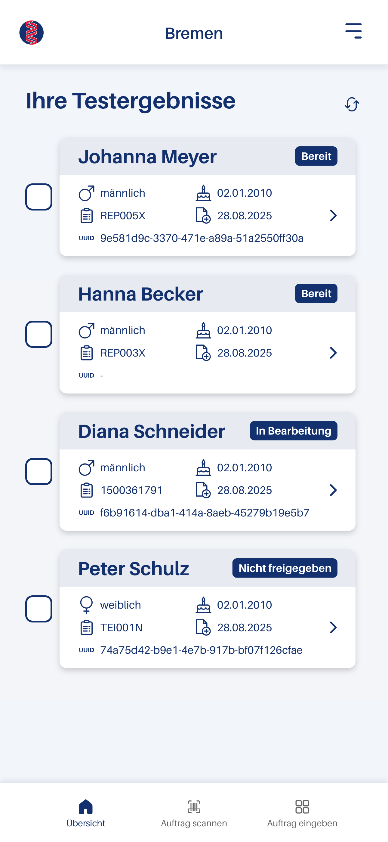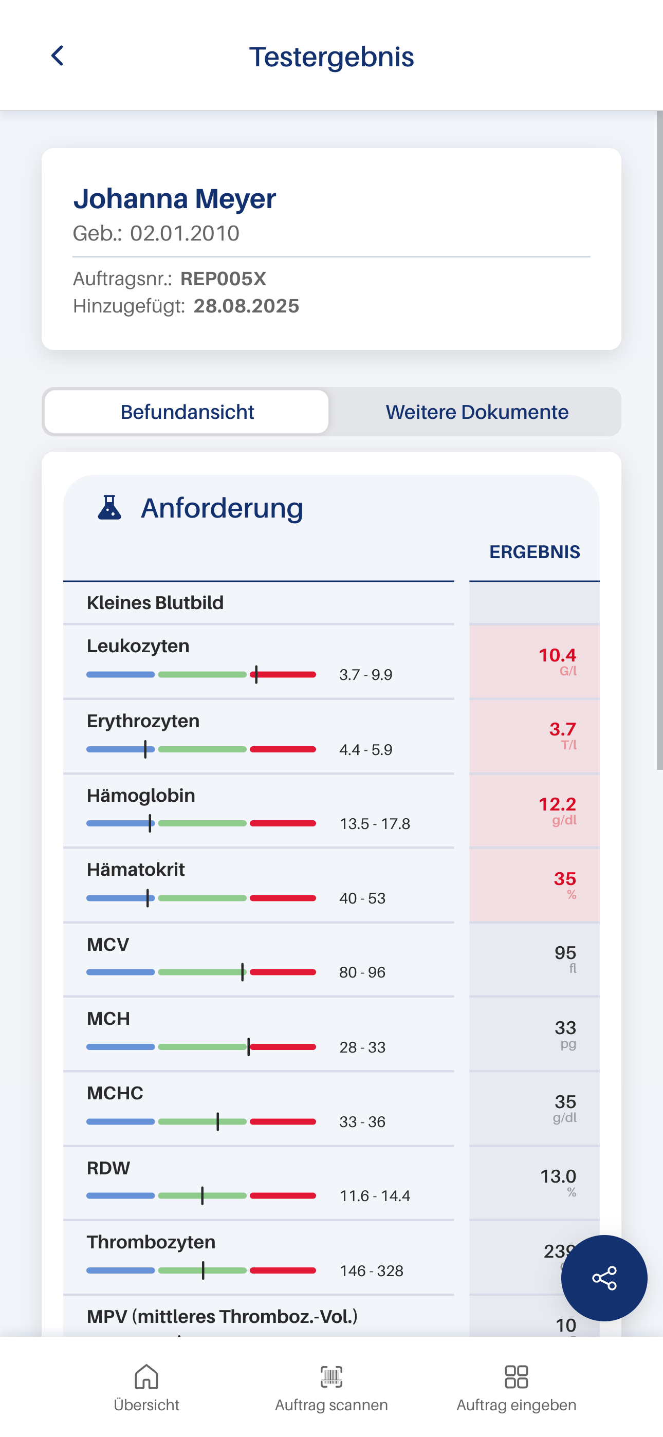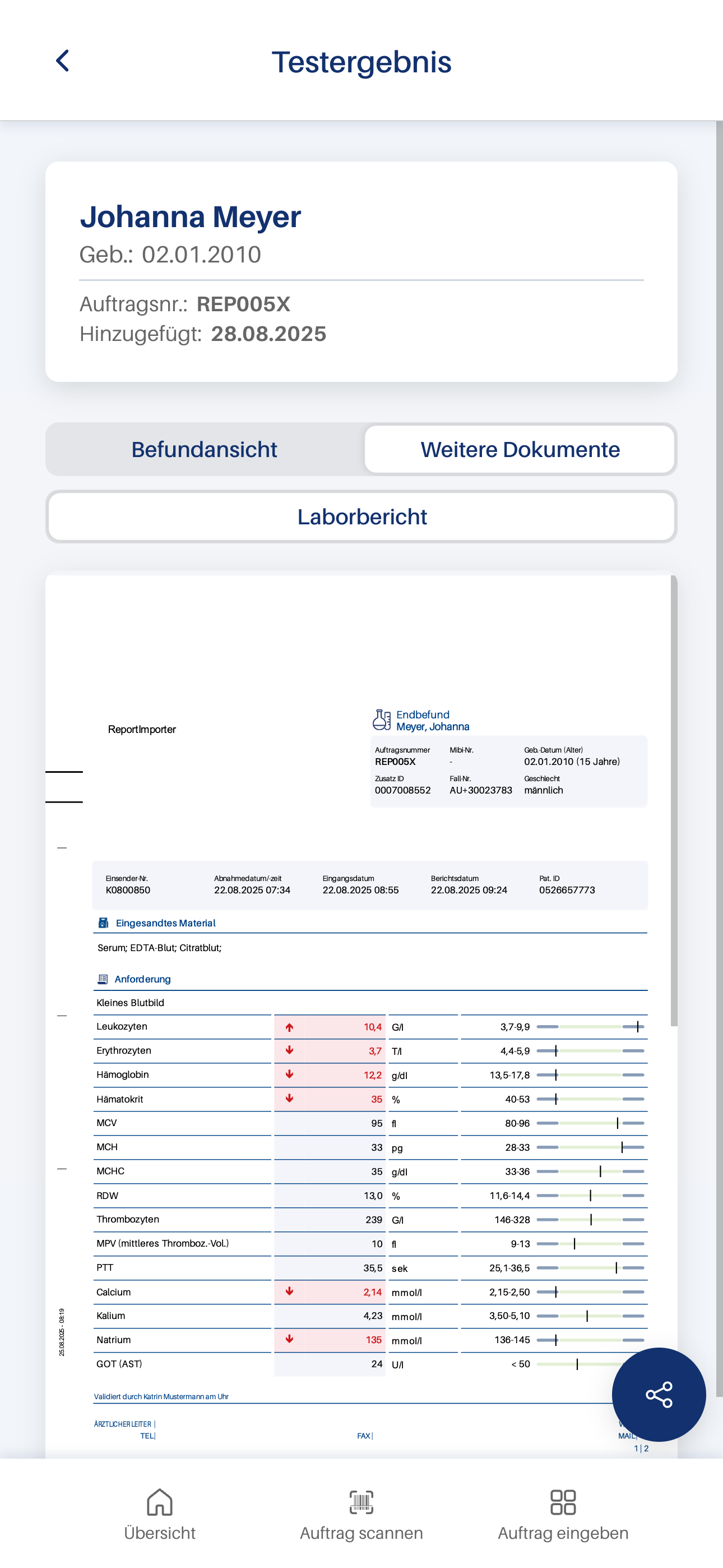 Sobald Ihre Ergebnisse fertig sind, können Sie diese passwortgeschützt auf unserer Website oder Patienten-App abrufen. Die Zugangsdaten zu Ihrem Befund erhalten Sie von uns nach der Blutentnahme.