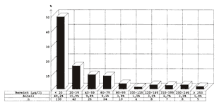 Zwischen der Quecksilberkonzentration im Speichel nach Kaugummikauen und der Quecksilberausscheidung im Harn nach Gabe von DMPS einerseits sowie dem aus Amalgamfüllungen in die Ausatemluft abgegebenen dampfförmigen Quecksilber andererseits besteht eine Korrelation. Da die Quecksilberausscheidung im Harn nach DMPS und die Konzentration des toxikologisch wichtigen dampfförmigen Quecksilbers in der Ausatemluft ein Maß für die Quecksilberbelastung sind, wird der Kaugummi-Test als Suchtest auf eine erhöhte Quecksilberbelastung durch Amalgamfüllungen empfohlen. Leider existieren bisher keine eindeutigen Grenzwerte, so dass eine Interpretation der Messergebnisse schwierig ist. Die in der Abb. dargestellte Häufigkeitsverteilung der Quecksilberkonzentrationen im Speichel nach Kaugummikauen vermittelt jedoch einen Eindruck von der sehr unterschiedlich intensiven Korrosion. Obwohl alle Patienten mehr als 10 Amalgamfüllungen hatten, fanden sich bei fast 50% relativ niedrige Quecksilberkonzentrationen von < 20 µg/l.